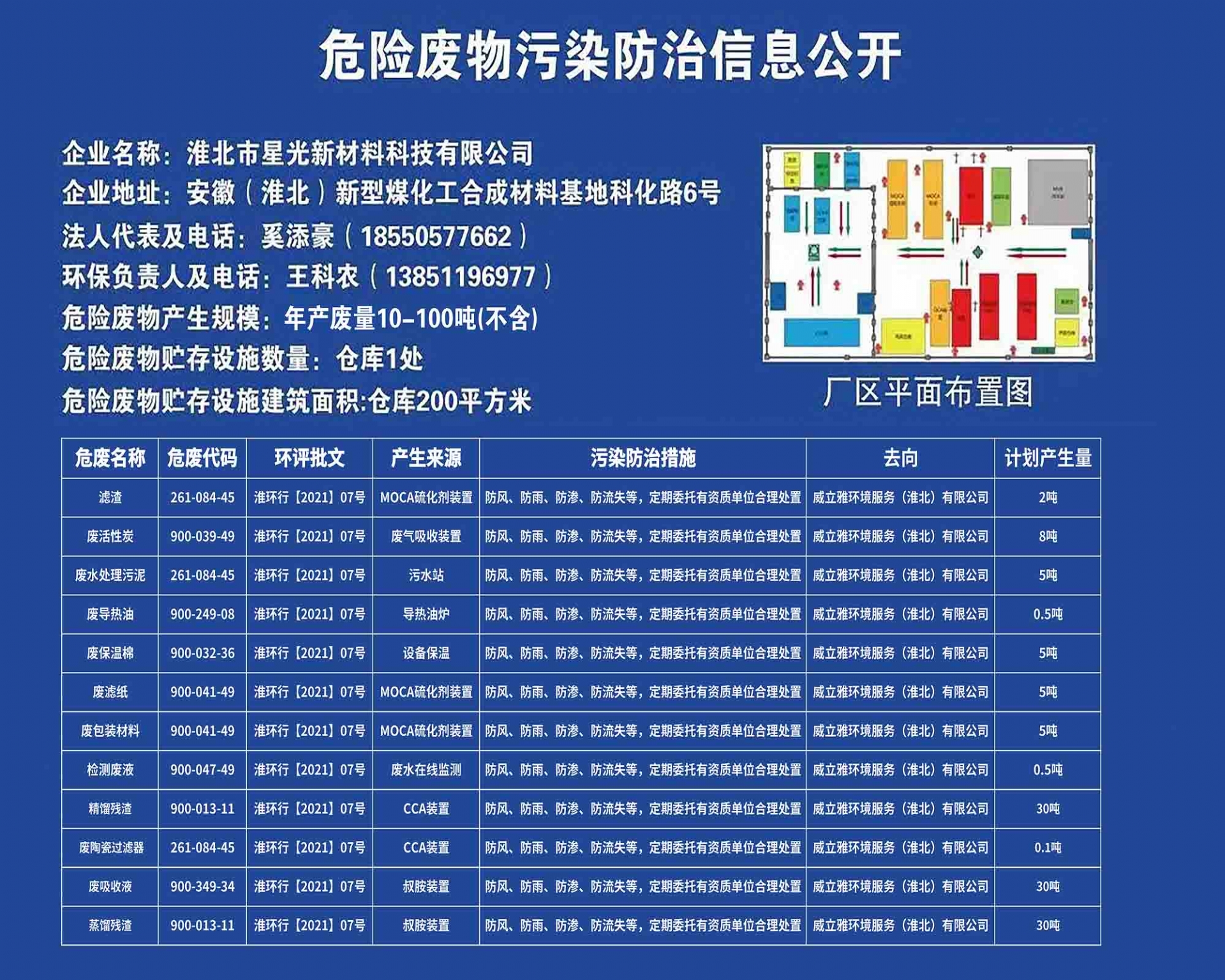 淮北市星光新材料科技有限公司10000t/a聚氨酯橡膠硫化劑MOCA、10000t/a鄰氯苯胺項(xiàng)目(一期)配套建設(shè)的環(huán)境保護(hù)設(shè)施調(diào)試時(shí)間延期公示根據(jù)關(guān)于發(fā)布《建設(shè)項(xiàng)目竣工環(huán)境保護(hù)驗(yàn)收暫行辦法》的公告(國(guó)環(huán)規(guī)評(píng)[2017]4號(hào))的要求,我公司10000t/a聚氨酯橡膠硫化劑MOCA、10000t/a鄰氯苯胺項(xiàng)目(一期)配套建設(shè)的環(huán)境保護(hù)設(shè)施調(diào)試起止日期為2022年2月19日——2022年5月18日。